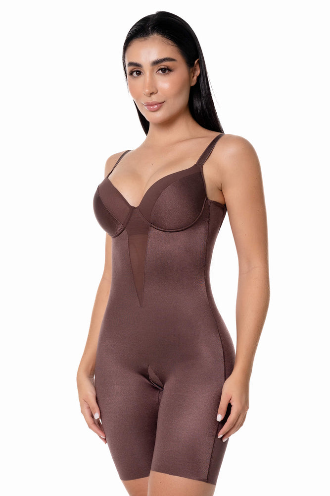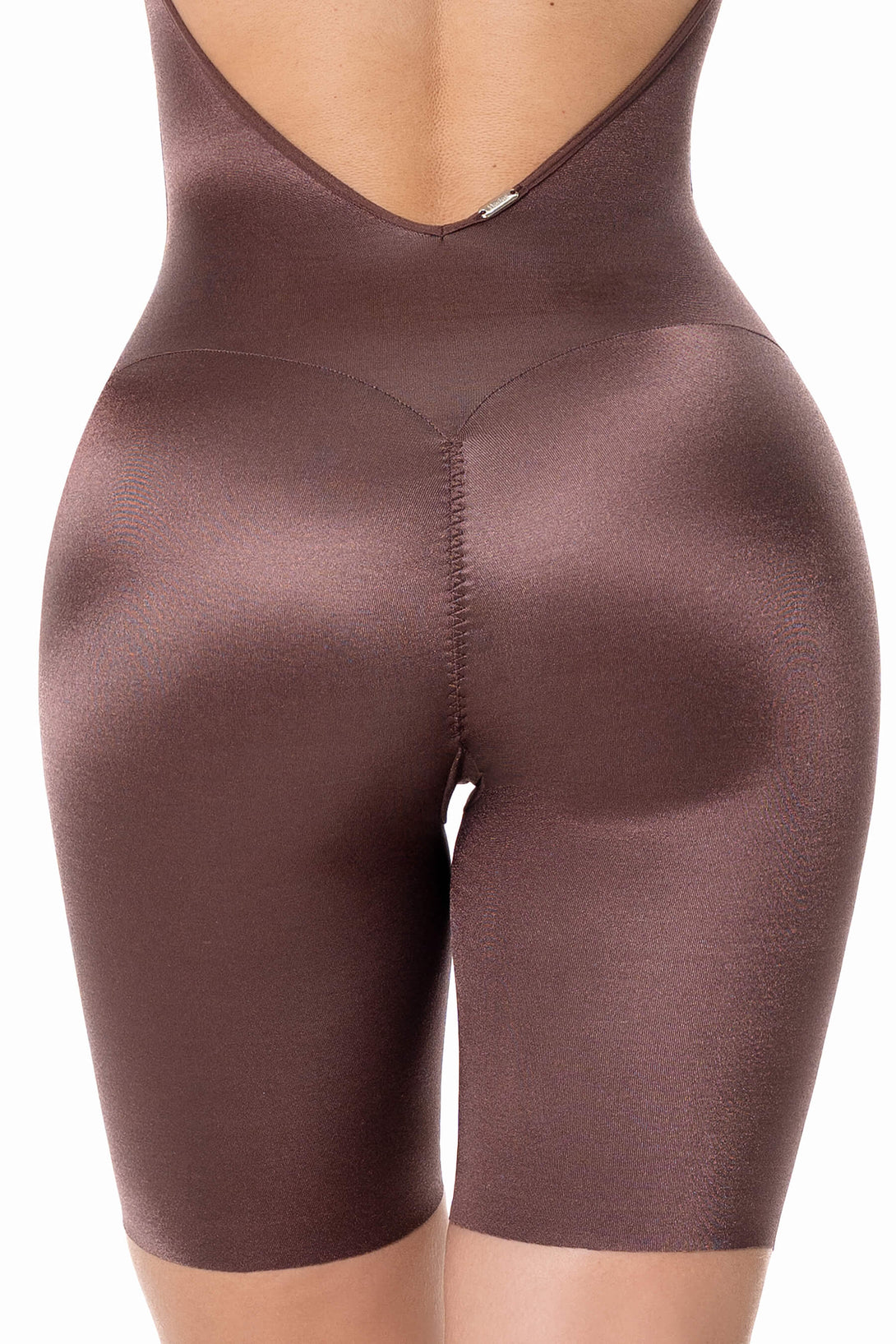 Moldeador en short corto, con corte en powernet en copa y delantero, copa con estructura, abertura perineal y cargaderas ajustables.
